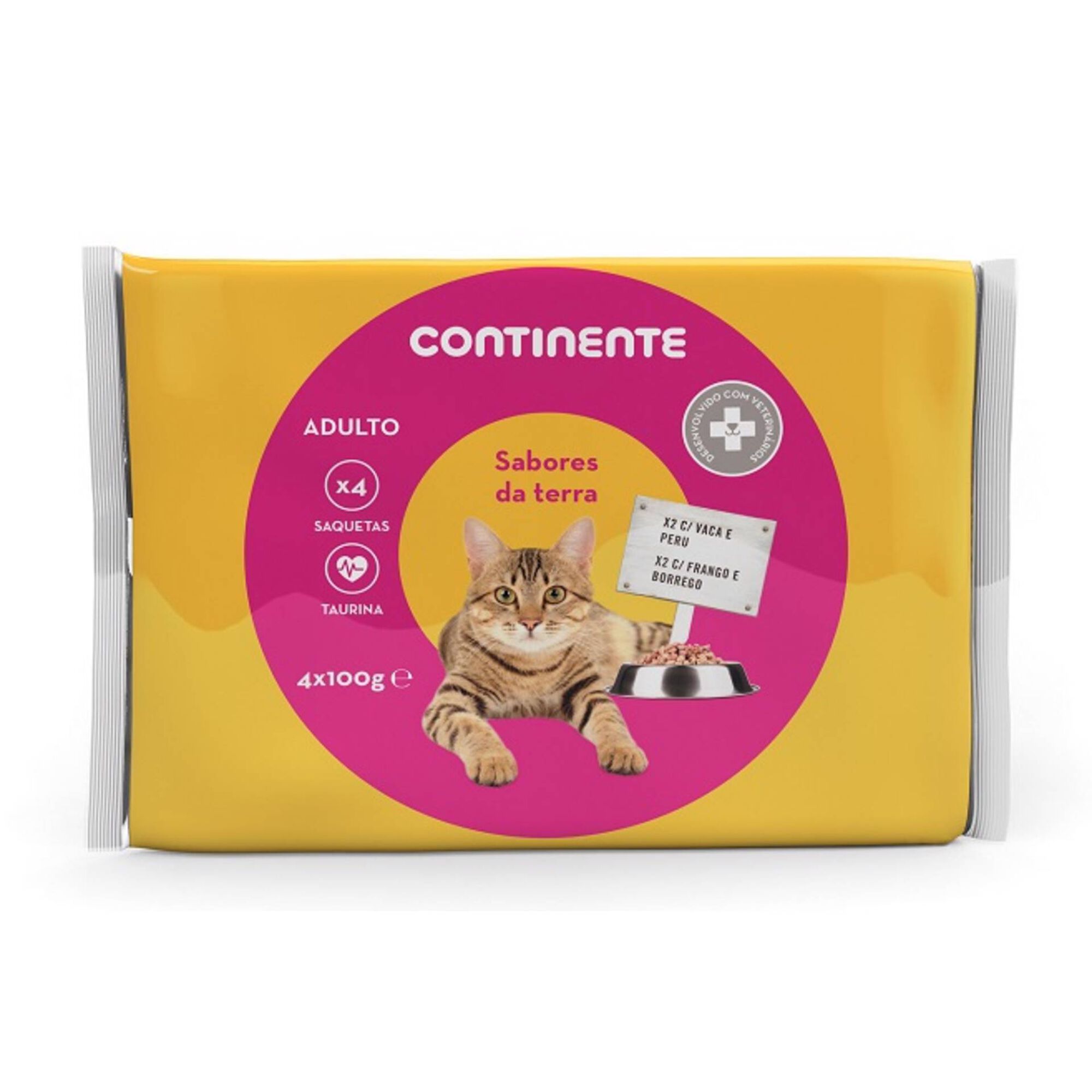 Pedaços com vaca e perú em molho: carnes e subprodutos animais (vaca 4%, perú 4%), subprodutos de origem vegetal, extratos de proteínas vegetais, substâncias minerais e açúcares.