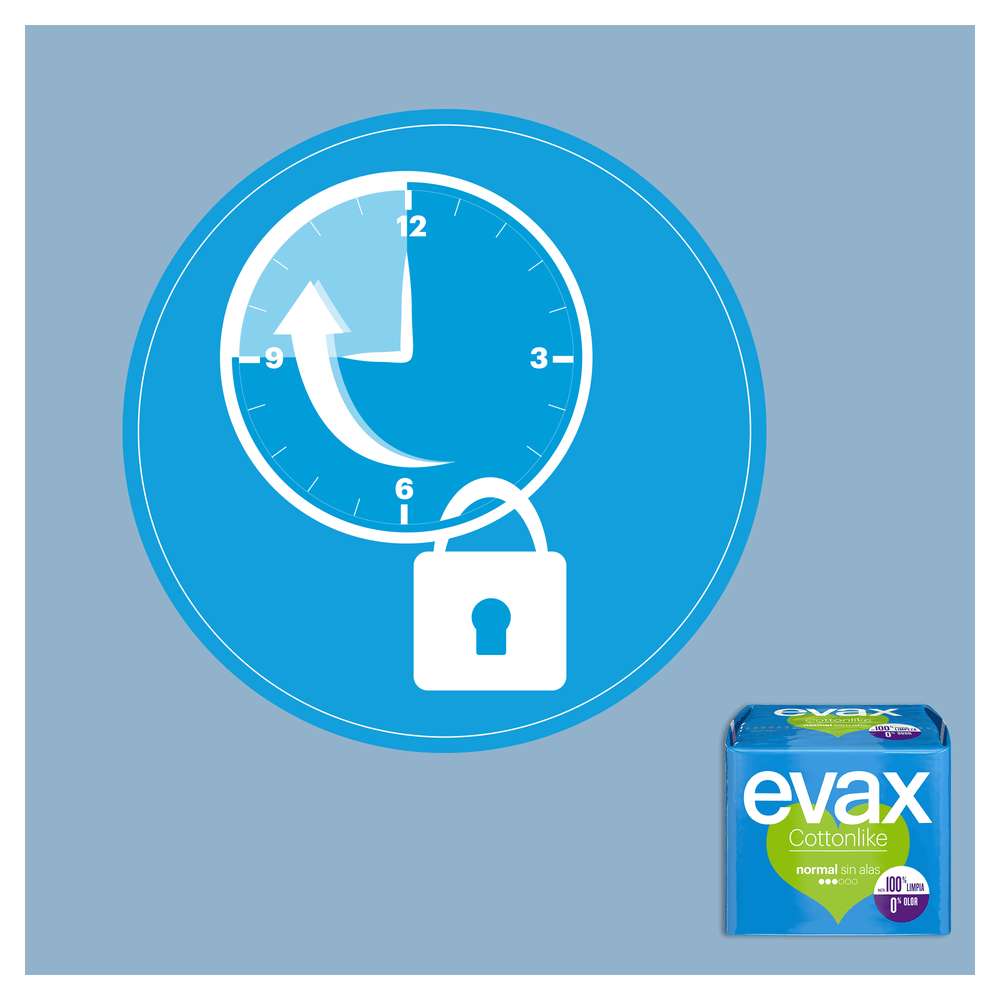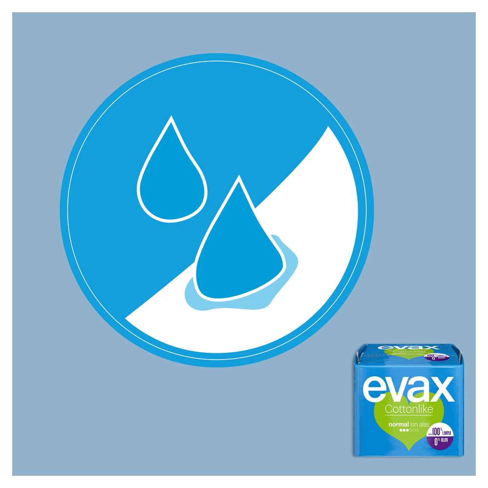 Os pensos higiénicos Evax Cottonlike são superabsorventes e mantém-te 100% limpa e sem odor. O sistema duplo Evax Cottonlike possui pérolas que neutralizam o odor, e o seu núcleo absorvente proporciona uma absorção instantânea. Com abas que fixam o penso às tuas cuequinhas e uma cobertura cottonlike que te oferece suavidade extra, estes pensos higiénicos são resistentes e confortáveis durante todo o dia. Disponíveis em diferentes níveis de absorção: Normal e Normal Plus para os dias de menor fluxo e fluxo regular; e Super e Super Plus para dias de fluxo abundante e muito abundante.