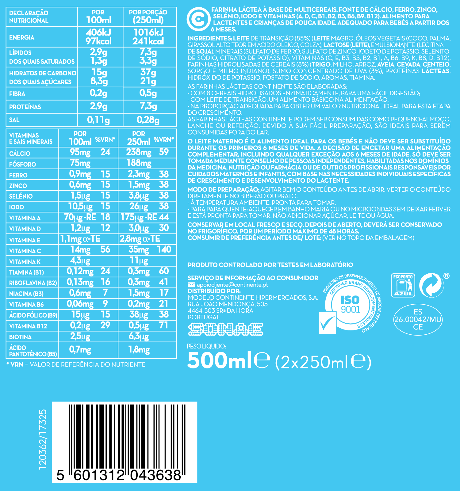 Farinha Láctea Multicereais Continente emb. 2 x 250 ml