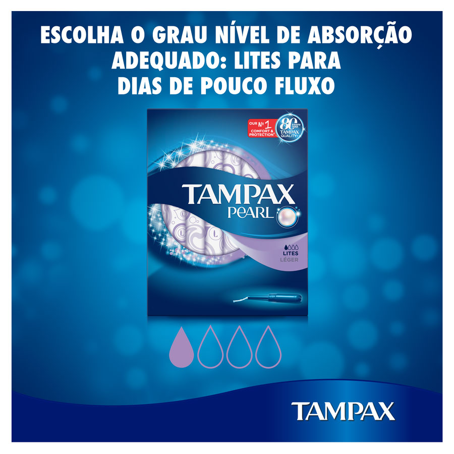 Os tampões Tampax Pearl Lites ajudam a evitar as fugas antes que aconteçam em dias de fluxo muito ligeiro a ligeiro enquanto estás com o período. Estes tampões incluem um aplicador de plástico SmoothTouch com cabo antideslizante e moldado para maior conforto e facilidade na inserção. A tecnologia FormFit do Tampax Pearl permite ao tampão expandir-se suavemente para se adaptar à forma do teu corpo e, combinada com o entrançado LeakGuard, ajuda a evitar as fugas. Com um invólucro que resiste na carteira e se abre facilmente e sem ruído, o Tampax Pearl permite a máxima discrição. Aplicador 5 vezes mais suave: Tampax Pearl vs. Tampax com aplicador de cartão. O melhor tampão Tampax Pearl para absorção de fluxo muito ligeiro a ligeiro.