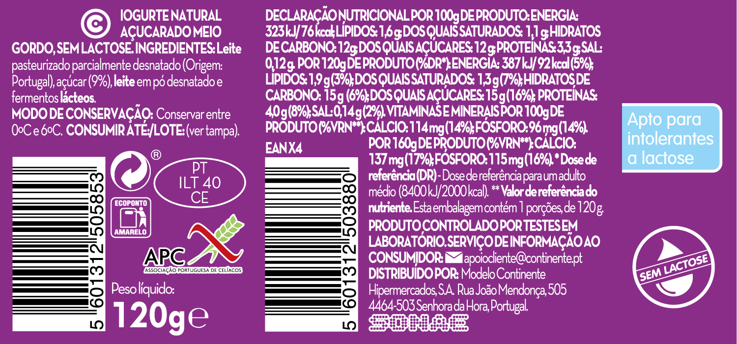 Iogurte sem Lactose Natural Açucarado Continente Equilíbrio emb. 4 x 120 gr