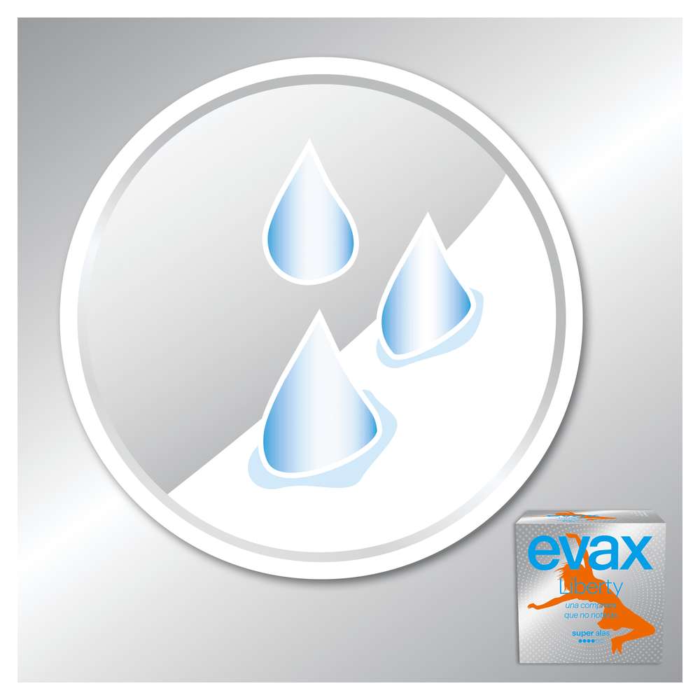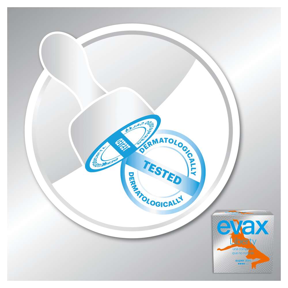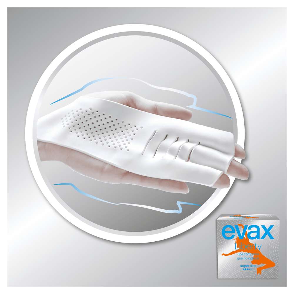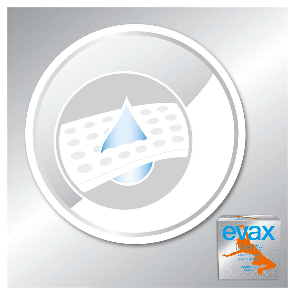 Evax Liberty é muito diferente de todos os pensos higiénicos que conheces. Isto porque Evax Liberty é fabricado exclusivamente com material flexível Flexicel, que se adapta perfeitamente ao seu corpo e afasta a humidade da sua pele, para que se mantenha muito mais confortável e limpa durante todo o dia. Também tem uma fragrância delicada que neutraliza os odores e a mantém fresca. Experimente “mais” na sua higiene feminina com os pensos higiénicos Evax Liberty.